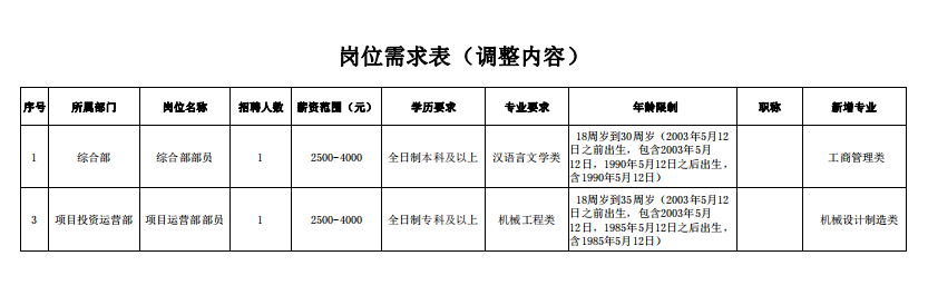 四、增加招聘數(shù)的崗位:項(xiàng)目工程部部員(項(xiàng)目管理類)(原2名調(diào)整為3名);融資財(cái)務(wù)部部員(會計(jì)學(xué),初級會計(jì)師)(原1名調(diào)整為2名);融資財(cái)務(wù)部部員(工商管理類、金融類,全日制本科及以上)(原1名調(diào)整為2名)。