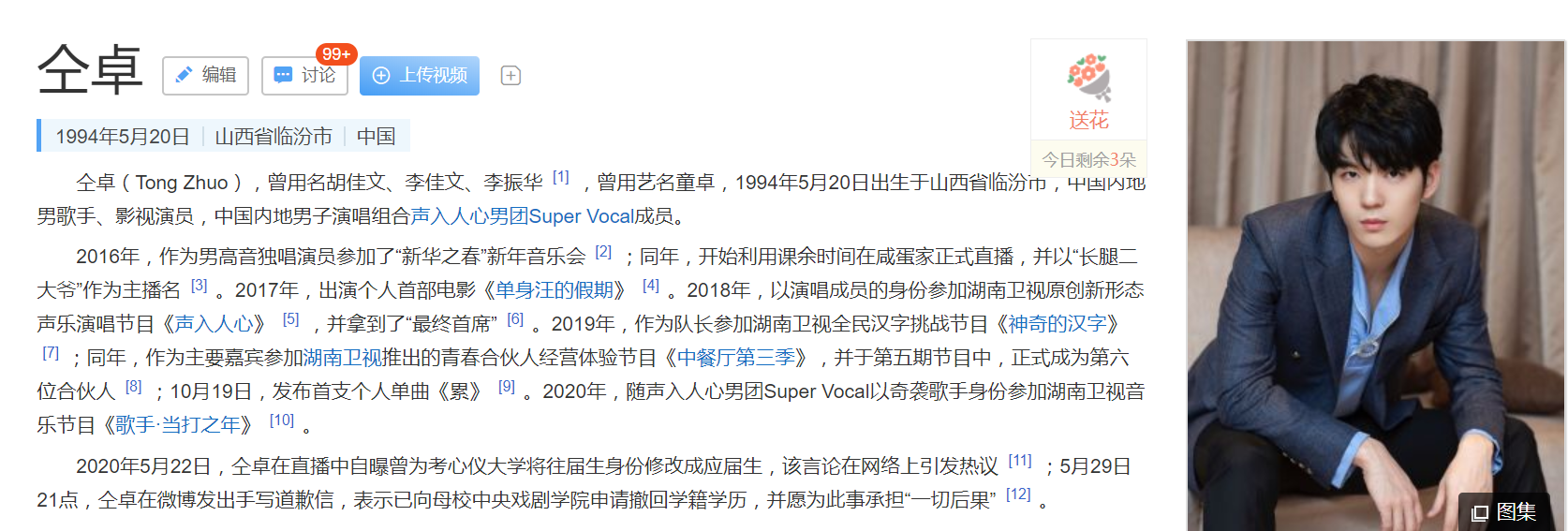 仝卓(Tong Zhuo),曾用名胡佳文、李佳文、李振華 ,曾用藝名童卓,1994年5月20日出生于山西省臨汾市,中國內(nèi)地男歌手、影視演員,中國內(nèi)地男子演唱組合聲入人心男團(tuán)Super Vocal成員。