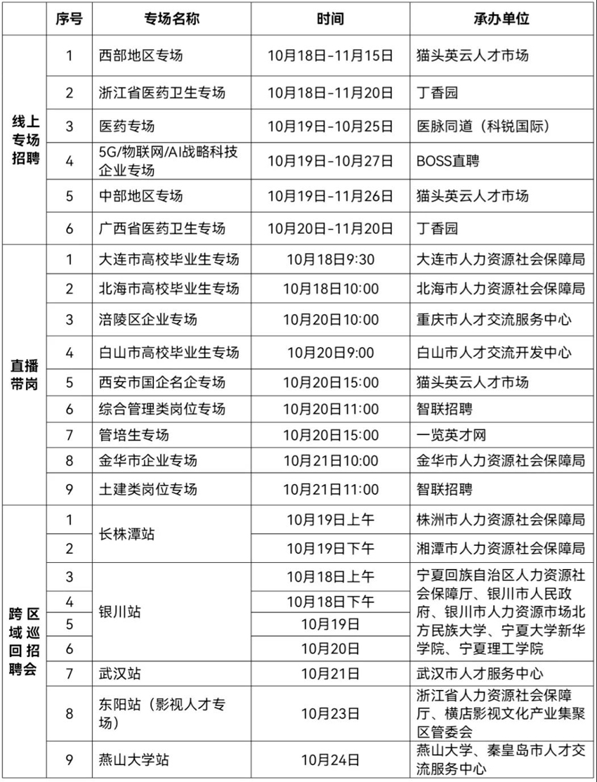 線下活動9場:舉辦長株潭站(2場)、銀川站(4場)、武漢站、東陽站、燕山大學(xué)站等9場跨區(qū)域巡回招聘會,除本地用人單位外,將邀請外省市人社部門組織用人單位組團參加。
